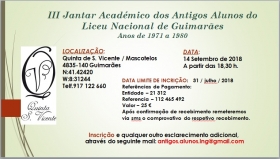 Por iniciativa de um grupo de antigos alunos do Liceu de Guimarães, com colaboração da AAELG Velhos Nicolinos, informamos que se irá realizar no próximo dia 14 de setembro de 2018 o III Jantar Académico dos Antigos Alunos do Liceu Nacional de Guimarães.