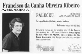 Encarrega-me o presidente da AAELG Velhos Nicolinos de comunicar o falecimento de Francisco da Cunha Oliveira Ribeiro, segundo-vogal de Festas da Comissão de Festas Nicolinas 1975, tesoureiro da Comissão de Festas Nicolinas 1976 e tesoureiro e pregoeiro da Comissão de Festas Nicolinas 1977.