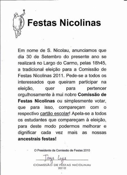 Estará presente, toda a cessante “Comissão de Festas Nicolinas 2010” trajada a rigor.